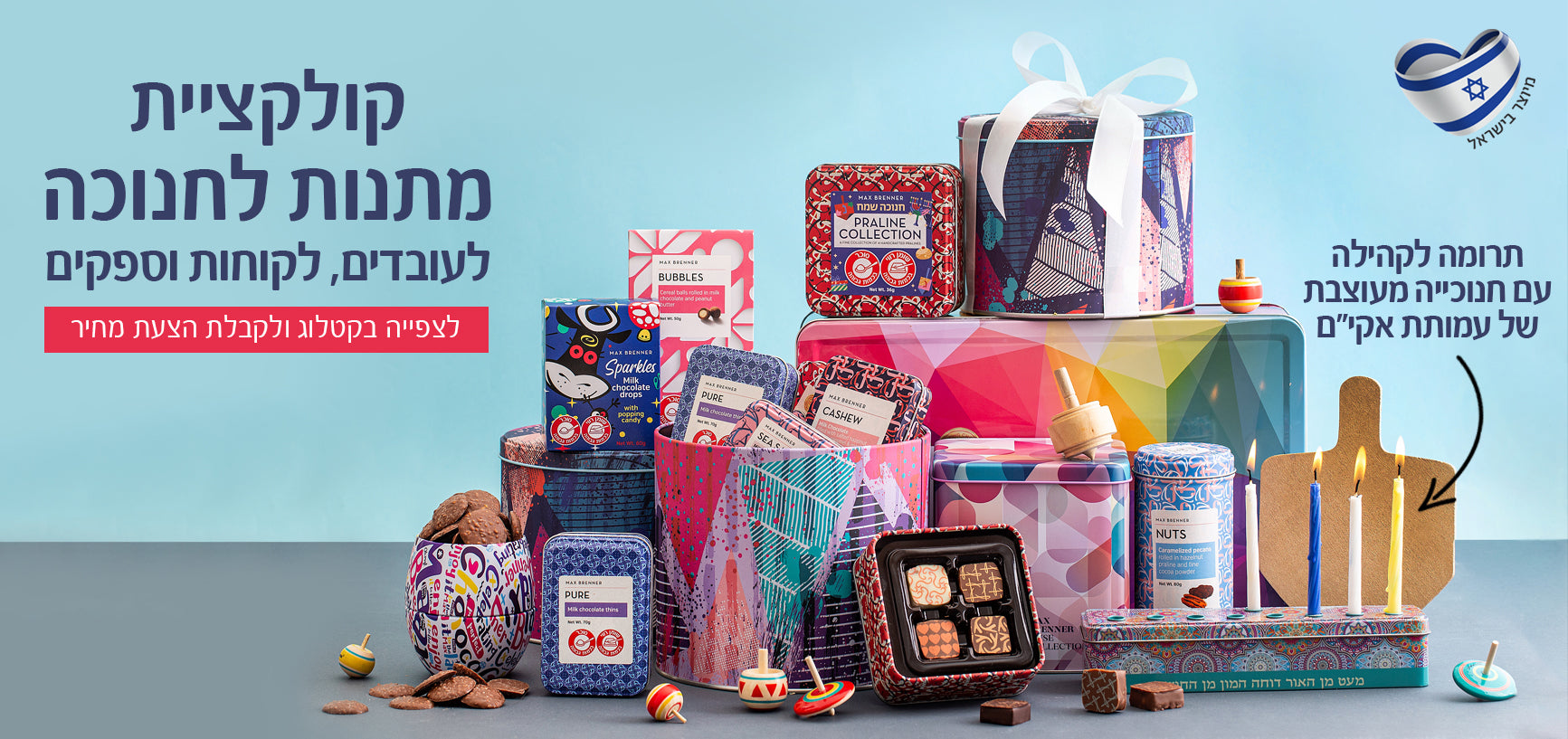 מקס ברנר יוצר תרבות חדשה של שוקולד. תרבות שעשתה מהפיכה ושינוי תפיסה והרגלים באופן שבו אנו צורכים שוקולד. עם מוצרי שוקולד העשויים מפולי קקאו מובחרים ומחומרי הגלם הטובים ביותר ובשילוב המארזים בעלי העיצוב האייקוני, הפכנו את החוויה האולטימטיבית לאוהבי שוקולד ברחבי העולם. אנו מזמינים אותך להתרשם מקולקציית המתנות שלנו. המתנה שמתאימה לכל אירוע.